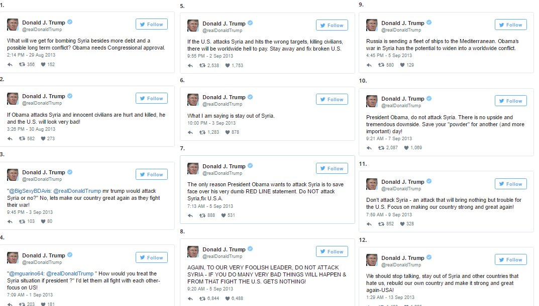 This isn't the first time either... he's given Obama shit for golfing and taking vacations etc. non-stop. He has several old tweets criticizing Obama for doing things that he is now doing. I'm so tired of this shit. On another note, how do you think Russia is going to react if at all to this? Putin wasn't notified and some media outlets are speculating that things are going to get real heated between the two. And lastly, this could possibly be a distraction from the Trump Russia ties? It seemed as though things were coming to a head and then all of a sudden lets attack Syria. He doesn't care about the chemical attacks... there's much worse going on around the world on a daily basis by governments against their own people. This could get fucky. |